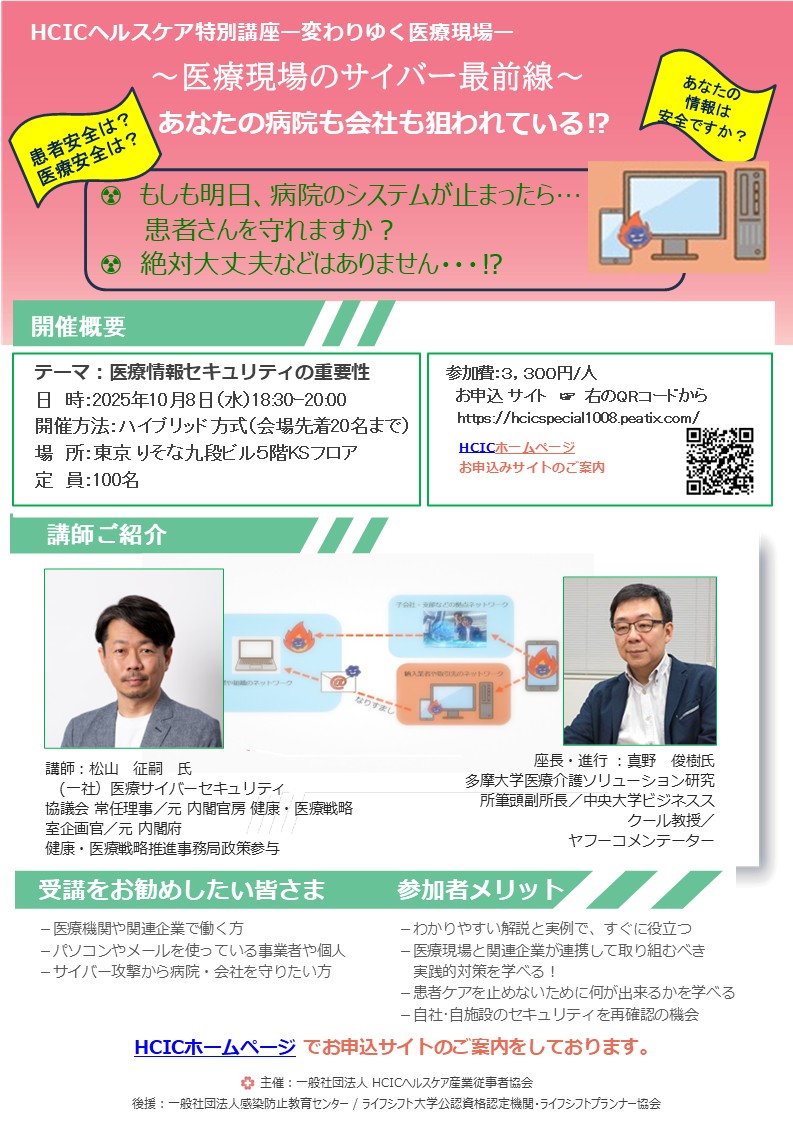 HCIC 秋の特別講座 医療情報セキュリティーあなたの情報は⁉ ~ 医療現場のサイバー最前線 ~